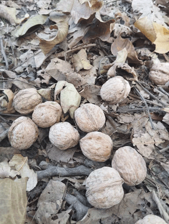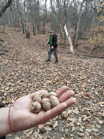 По его словам, орехи, падая, скатываются по склону, собираясь в ямках под корнями, иногда целыми кучками. Можно ходить, вороша листья палкой, искать кладовые, где природа приготовила маленькое чудо — грецкий орех. За несколько часов поиска можно найти десятки килограммов орехов. Однако за орехами также охотится вся горная живность, начиная от крохотной мышки, заканчивая косулей и кабаном.