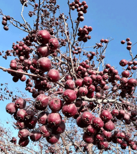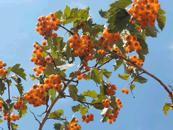 Румянцем плоды покроются лишь в сентябре, а до того времени окраской неотличимы от листвы. Краснеют ягоды — краснеет и листва. В октябре кустарник сбрасывает свои листья-ромбы и ветви остаются сплошь облепленными роскошными кистями. На каждой кисти горсточка мелких яблочек. Бывают они и круглые, вроде крупных горошин, и продолговатые, как семена фасоли. А однажды в ущелье Кара-Балта я видел плоды боярышника жёлтого цвета величиной с куриное яйцо.